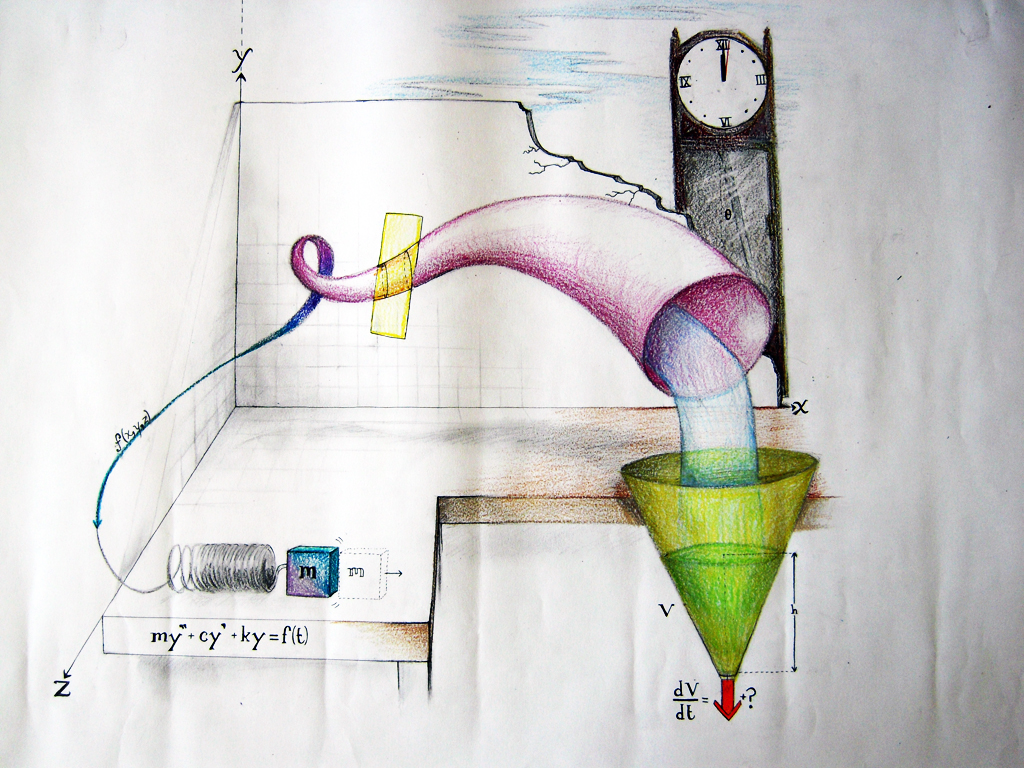 This colored pencil drawing was created by Elly Schofield in Spring 2010 for an introductory course in Differential Equations. The goal of the work is to visually represent the shared context and commonalities of applications of ordinary differential equations. Its delicate surrealism displays multiple applications with a striking precision, juxtaposing full color and grayscale renditions of the flow rate of a fluid, a mass-spring system, and a pendulum.
