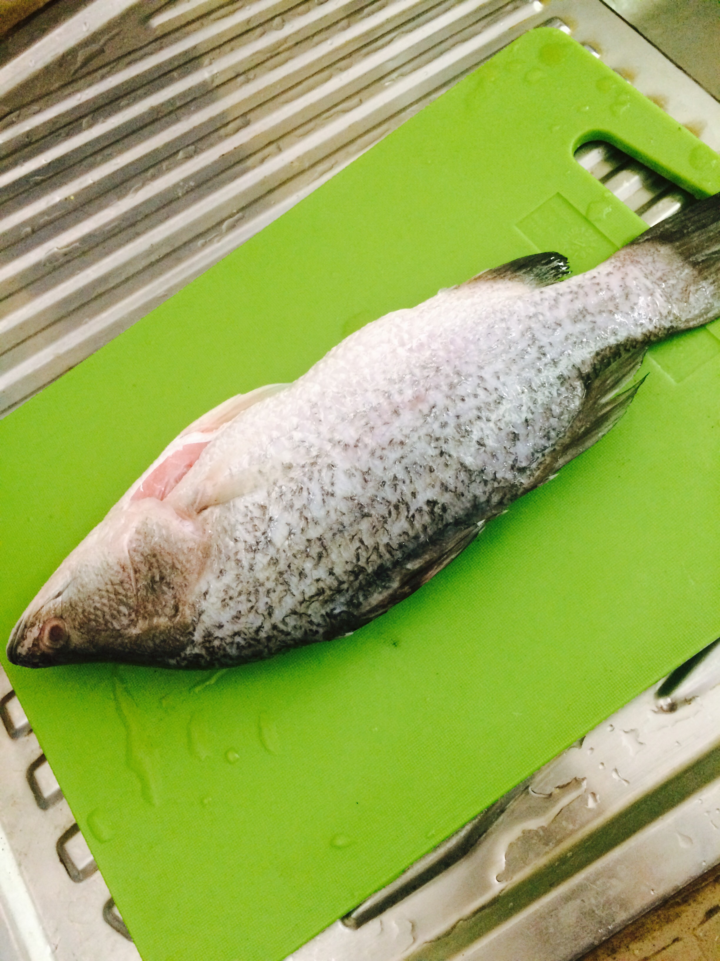 I bought this sea bass from supermarket. Yet, I found it too big and we didn’t have a pan big enough to cook it. So I decided to divided it into two parts. Fish head for the soup. Fish body and tail for the braised one.