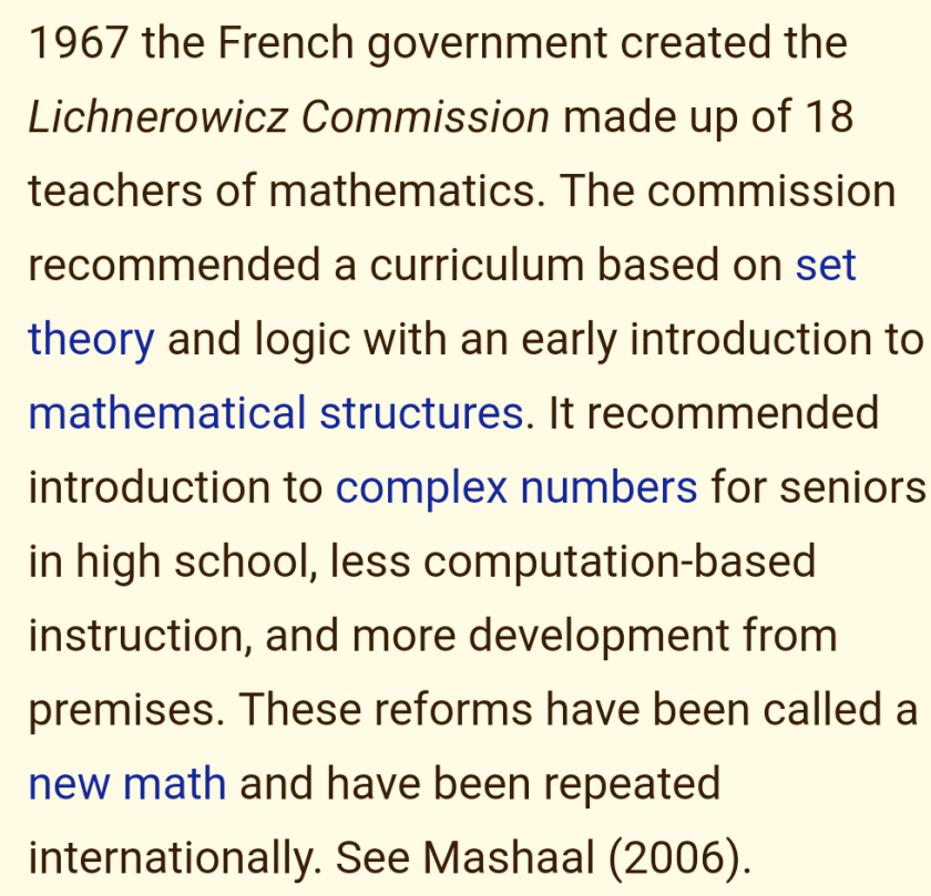 See the 1970s FrenchBaccalaureate Math Textbooks:(for UK Cambridge GCE A-level Math students, this is totally new “New Math” to us !)