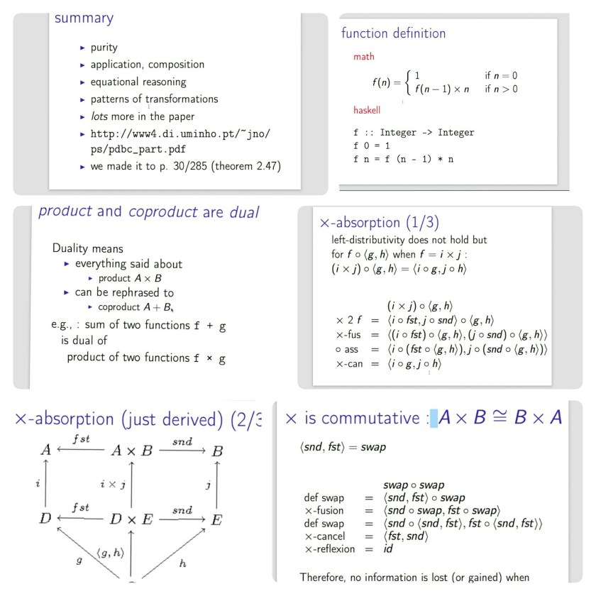 The examples use Haskell to explain the basic category theory : product, sum, isomorphism, fusion, cancellation, functor…