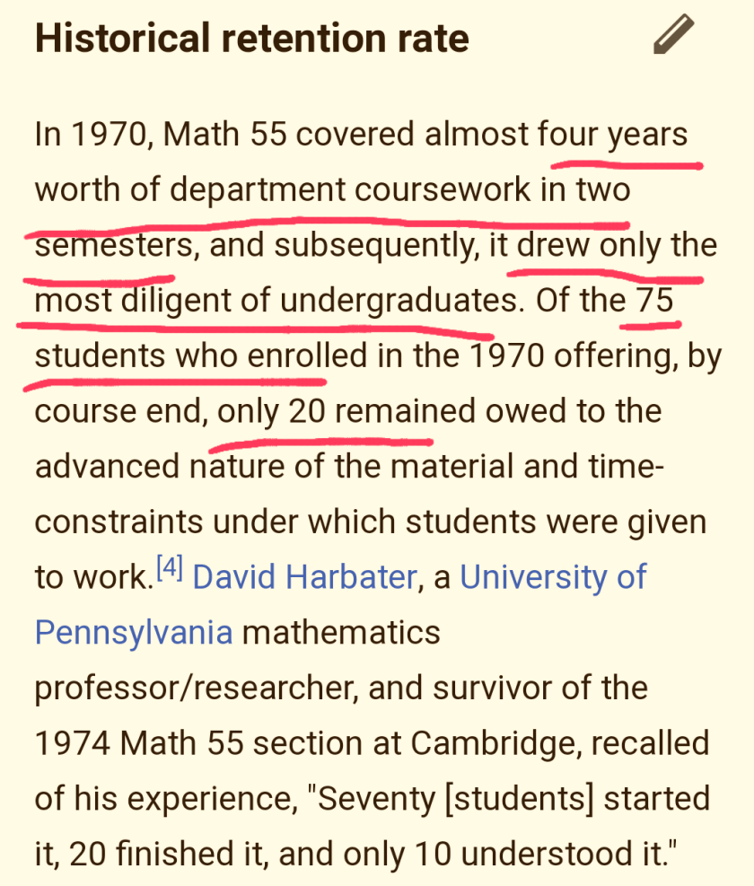 Note: Harvard “Math55” is even tougher than the “notorious” French Classe Préparatoire, which is a 3-year Math undergraduate courseware squeezed in 2 years : 1st year (code-name “un-demi” or “1/2”) Mathématiques Supérieures; 2nd year (“trois-demi” or “3/2”) Mathématiques Spéciales.