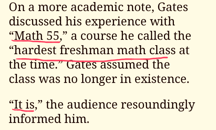 Bill Gates, a top Math student at Harvard entrance exams, recalled his first year Harvard “Math55” Course (Advanced Calculus & Linear Algebra) – the toughest at his time because 4 years of Math coursewares condensed into 1 year (2 semesters) !