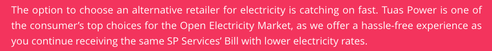 After extensive research, I find that Tuas Power is one of the best alternative electricity suppliers. Especially after several electricity providers (e.g. Ohm, iSwitch) have shut down.