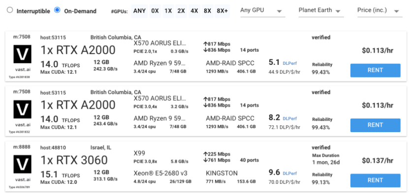 There are two modes of rental on Vast.AI: interruptible and on-demand. The interruptible mode is on a constant bidding basis, with the highest bidder able to take over the GPU usage rights at any time. The good point is that the interruptible mode rentals are extremely cheap.