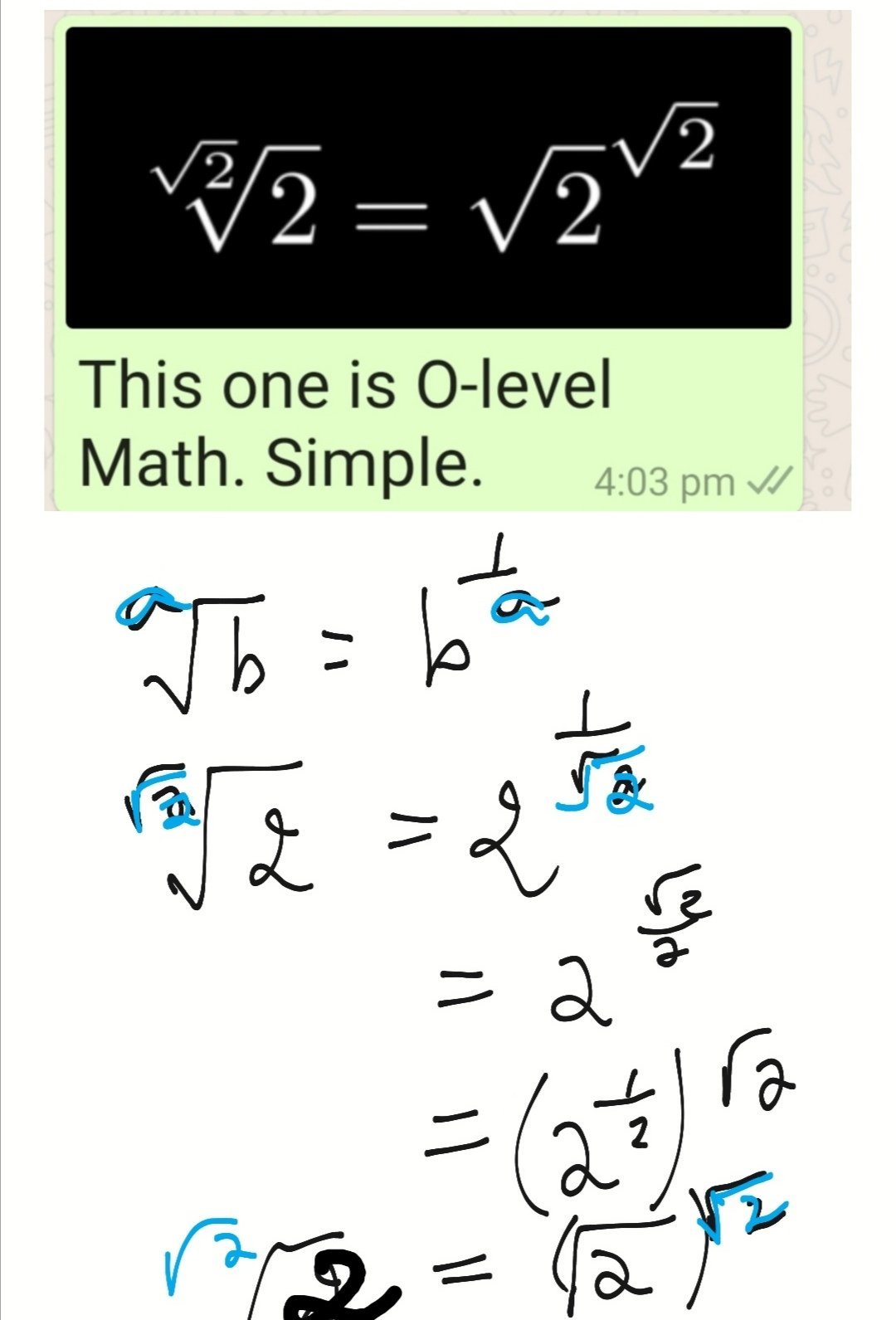 $latex boxed{a = a^{a^{a^ {{…}^{a}}}}}&fg=aa0000&s=3$ $latex text {…. [A] } $