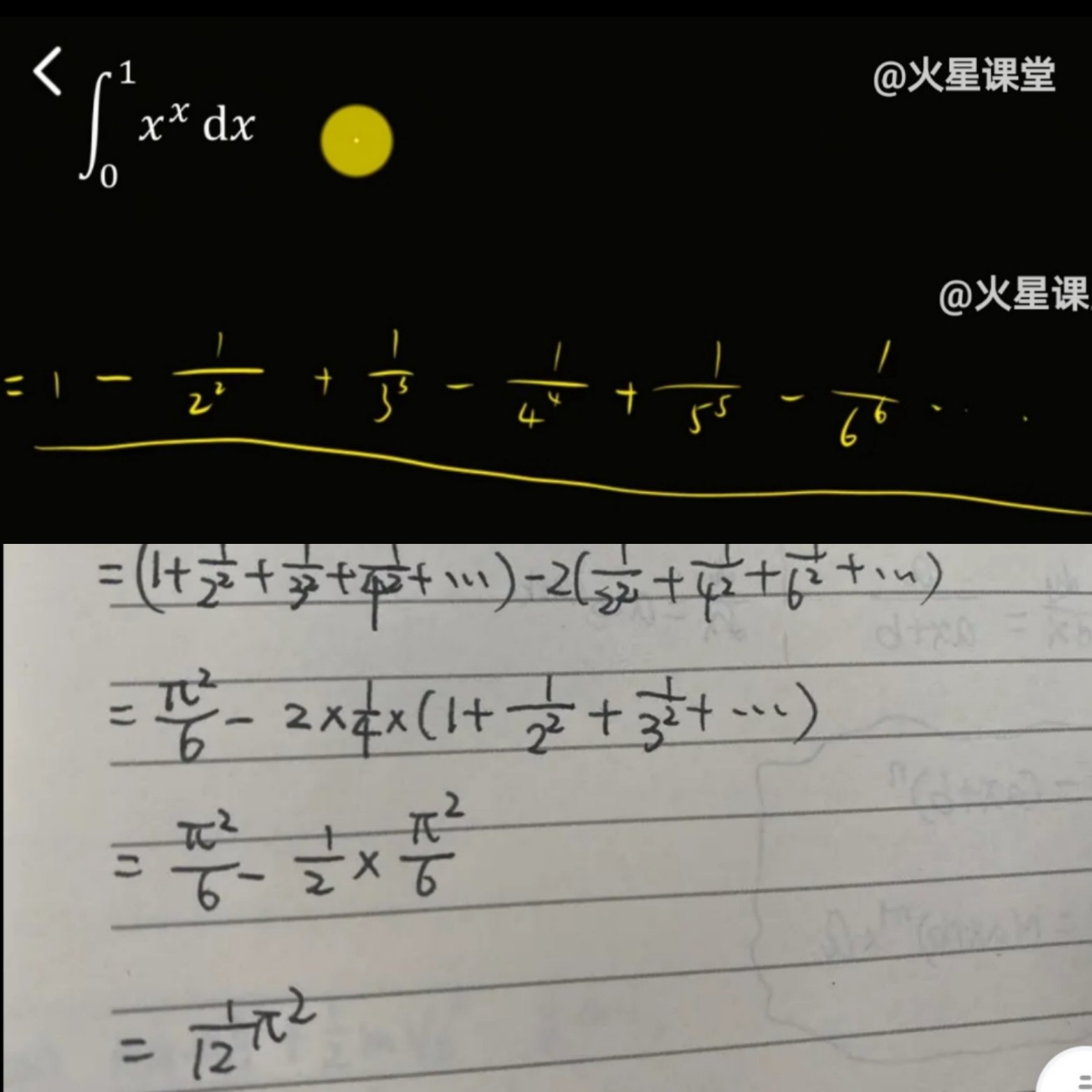 $latex displaystyle {int_{0}^{1} x^{x} dx = frac {pi^{2}}{12} }&fg=aa0000&s=3$