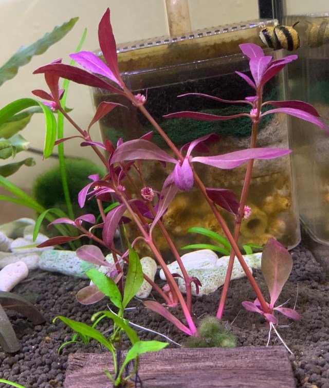 Red plant (Ludwigia repens?) in low tech 5 gallon tank. No CO2. I bought this red stem plant for my fish to celebrate Chinese New Year. Hope it can survive in my tank!