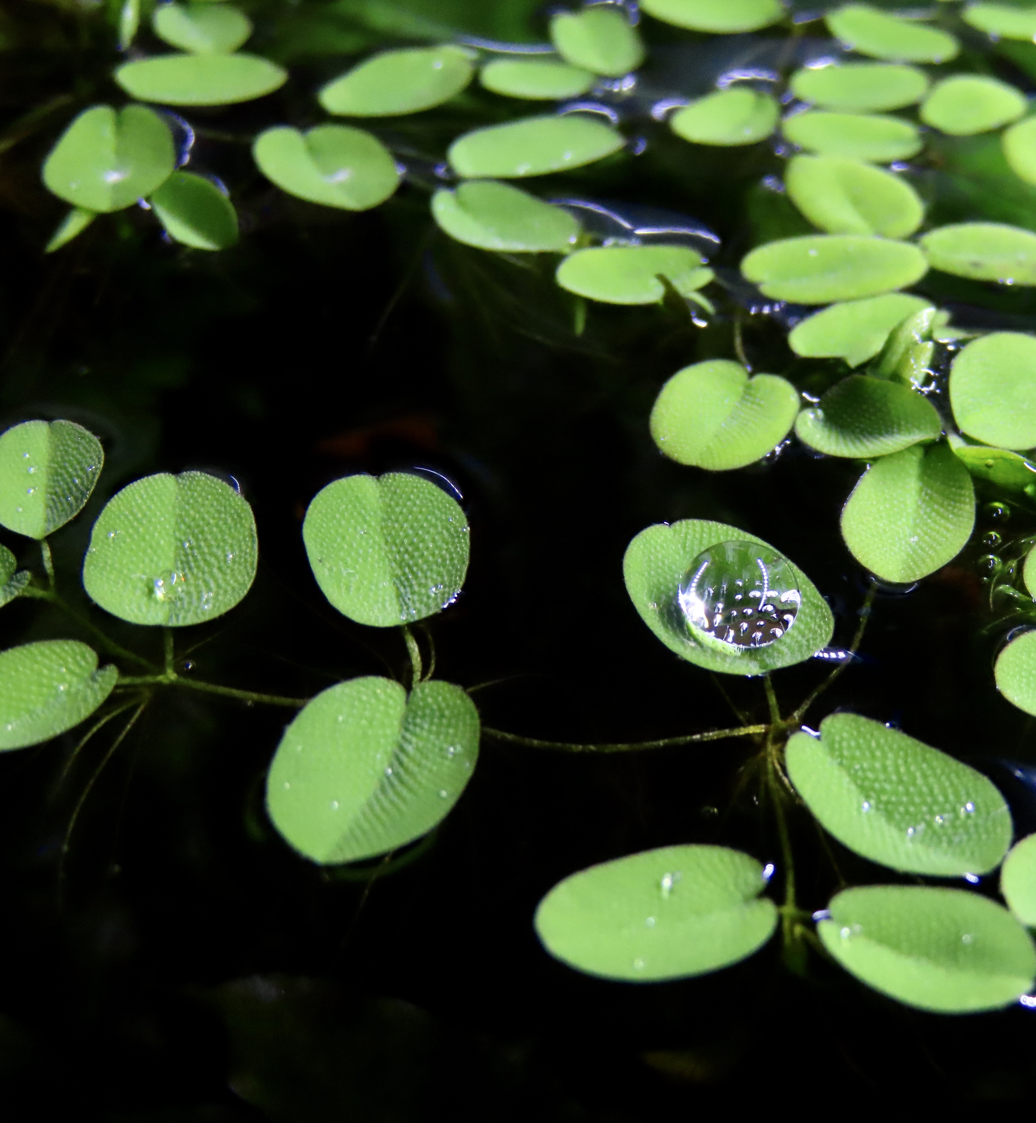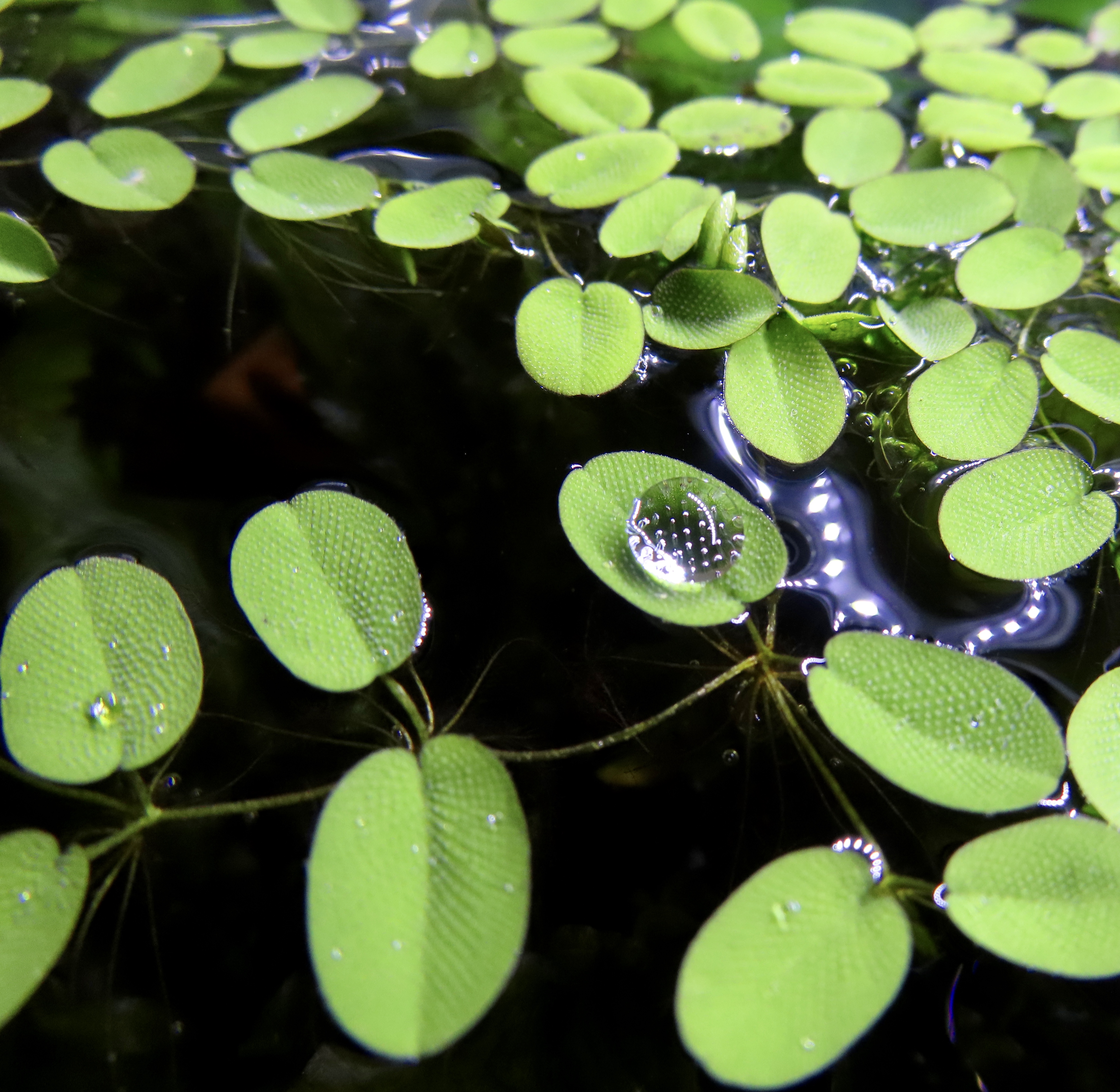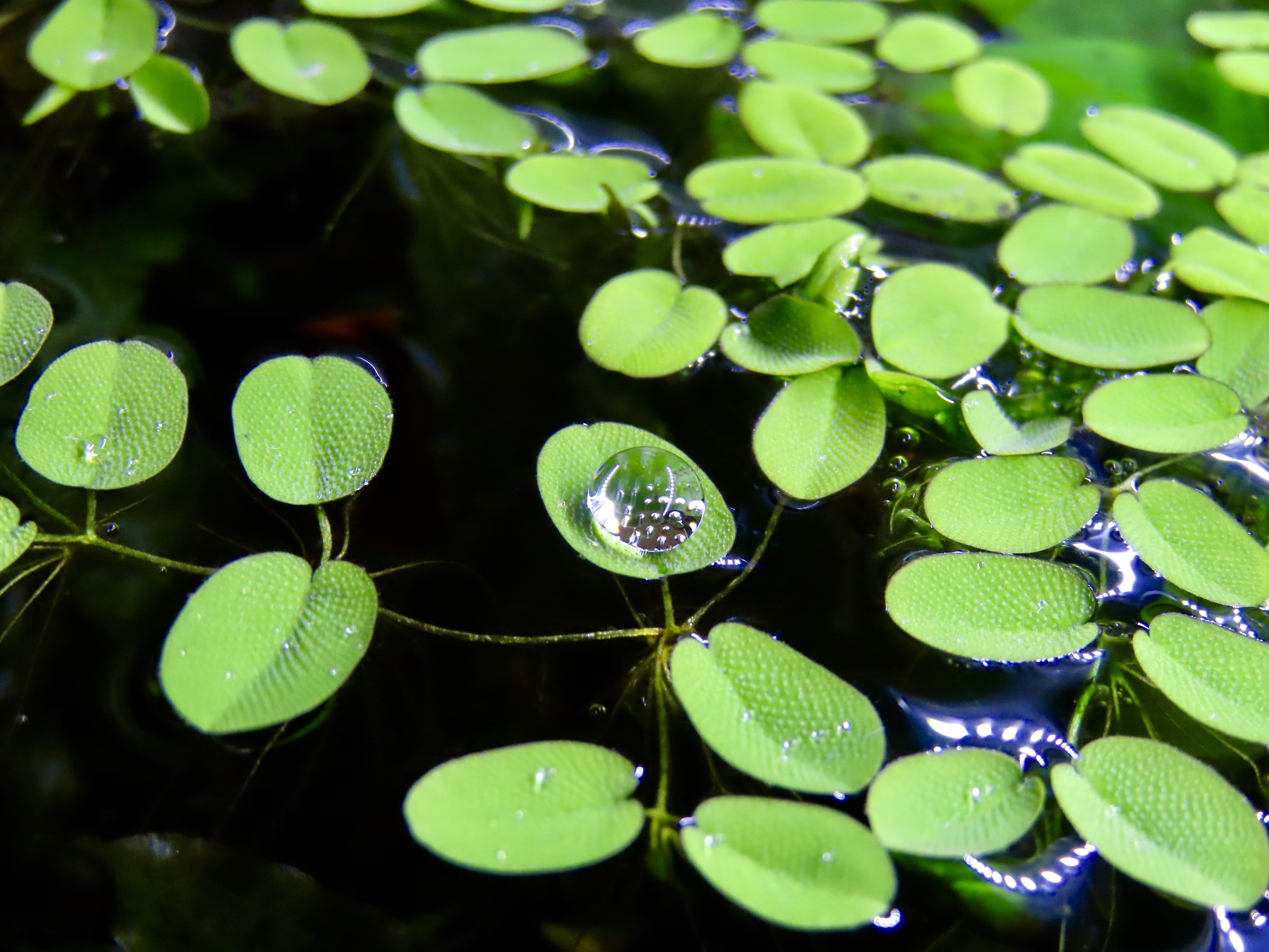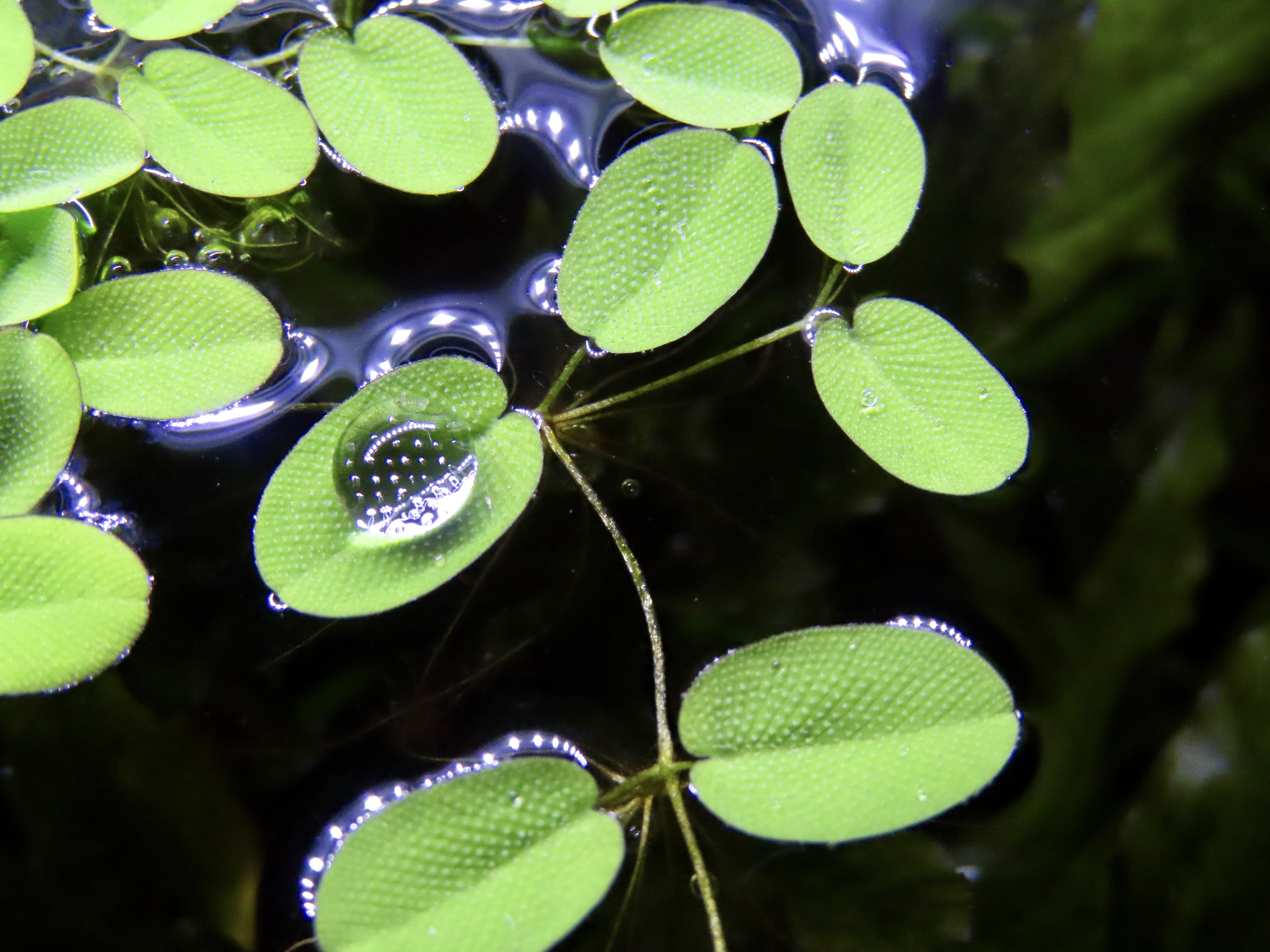 Some photos of spherical water droplets on Salvinia floating plant.