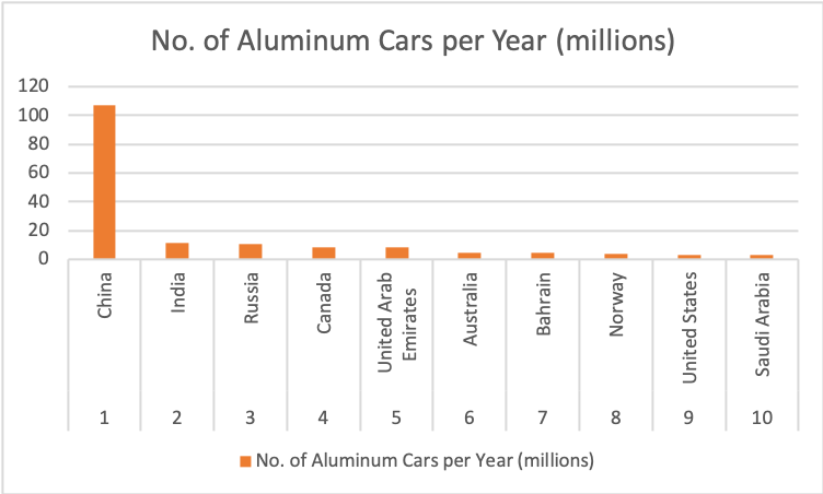 China can make 36,000,000,000/335 = 107 million aluminum cars per year
