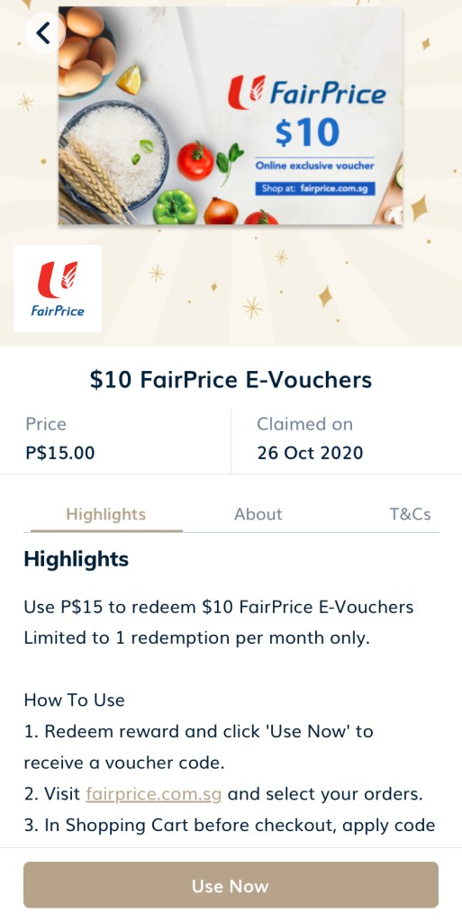 With P$15 PolicyPal credits, you can then redeem your free $10 FairPrice E-Voucher, as shown below. Throughout the entire process, there is no need to fork out a single cent of your own.
