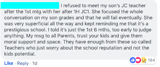 Excerpt: “I refused to meet my son’s JC teacher after the 1st meeting with her after 1st half of JC1. She focused the whole conversation on my son’s grades and that he will fail eventually. She was very superficial all the way and kept reminding me that it’s a prestigious school. I told her it’s just the 1st 6 months, too early to judge anything. My message to all parents, trust your kids and give them moral support and space. They have enough from these so called teachers who just worry about the school reputation and not the kid’s potential.”
