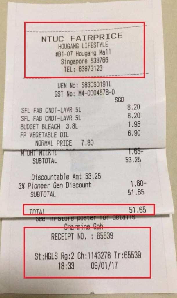 Similarly, I believe that this logic applies to Giant, Sheng Siong, Cold Storage receipt numbers too, it should be the transaction number, in the event that the receipt number is not clearly stated in the receipt. Same for NTUC Finest, NTUC Extra and all other types of NTUC Fairprice receipts.